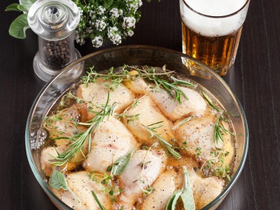 Coniglio marinato alla birra. Marinatura alla birra per la carne alla griglia. Ingredienti 1 coniglio 40 gr pancetta tesa 3 spicchio aglio 1 foglia alloro 23 rametto rosmarino qb. Un secondo piatto aromatico e saporito accompagnato con un contorno dal gusto agrodolce.